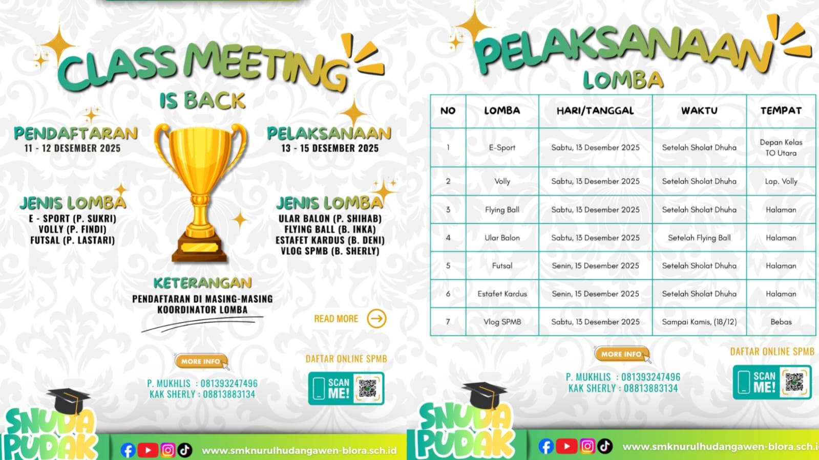 Seluruh rangkaian kegiatan disusun untuk memberikan ruang ekspresi bagi siswa di berbagai bidang, baik olahraga, permainan tradisional, maupun kreativitas digital. Pelaksanaan class meeting diharapkan dapat menjadi sarana pembelajaran nonakademik yang bernilai positif, menumbuhkan sportivitas, kerja sama, dan rasa kebersamaan di lingkungan SMK Nurul Huda Ngawen.